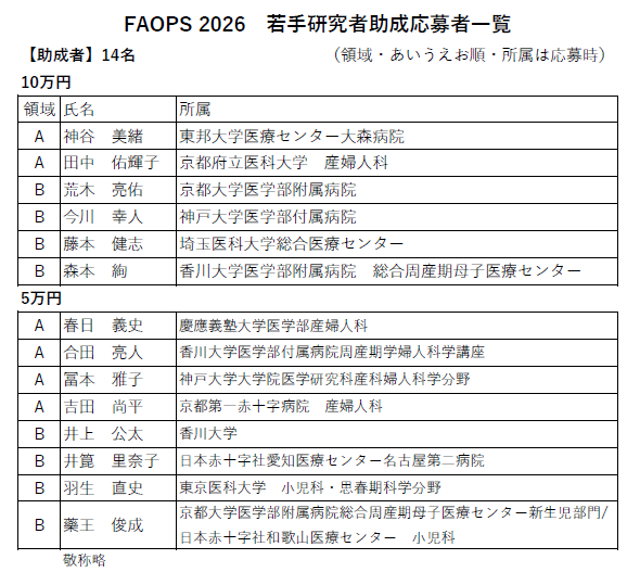 FAOPS 2026への「若手研究者派遣助成」に多くの会員の皆様に御応募いただき誠に有難うございました。